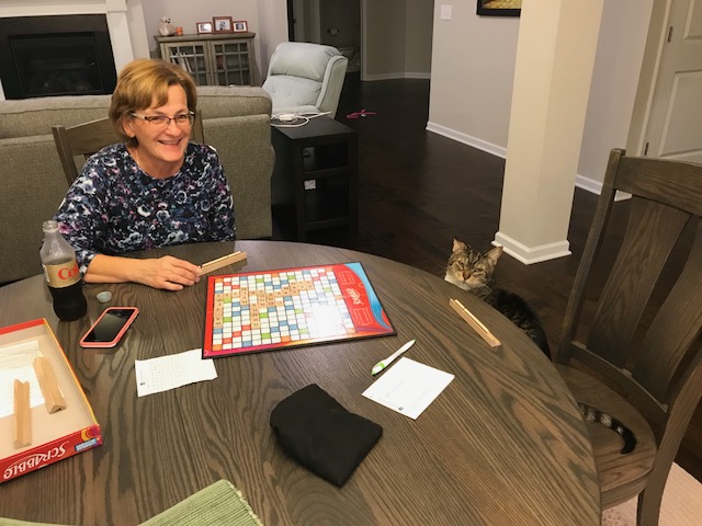 | Scrabble Game – Daisy sitting in for Cheryl (I may be able to beat Daisy….) |