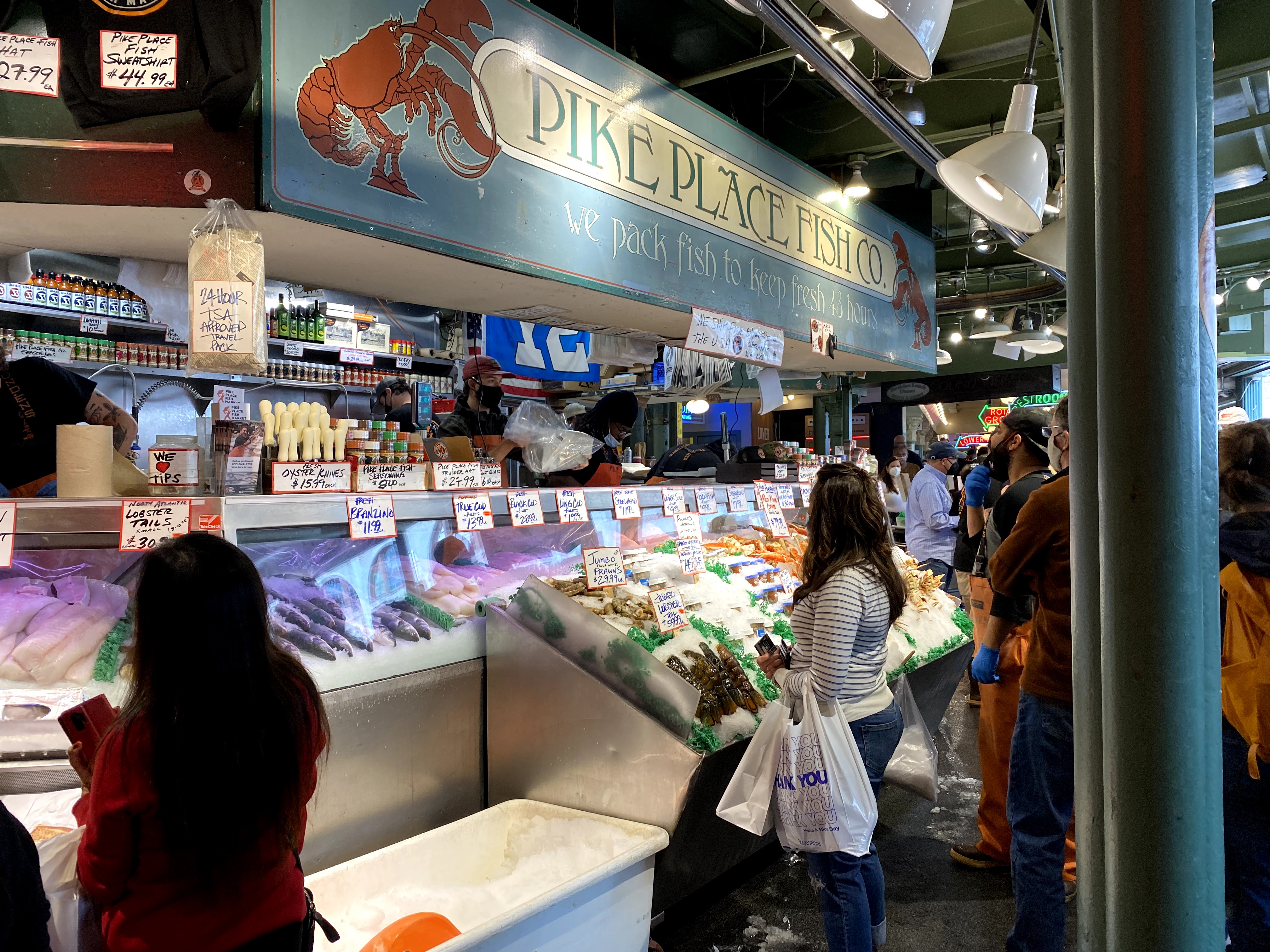 The Pike Place Market is probably best known for the fish markets and produce stands, but the large complex also includes prepared food stands, restaurants, retail stores, and a large craft market.