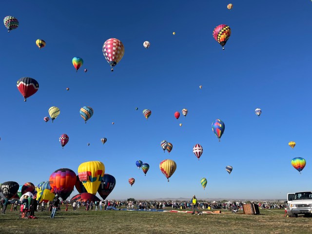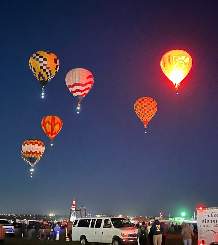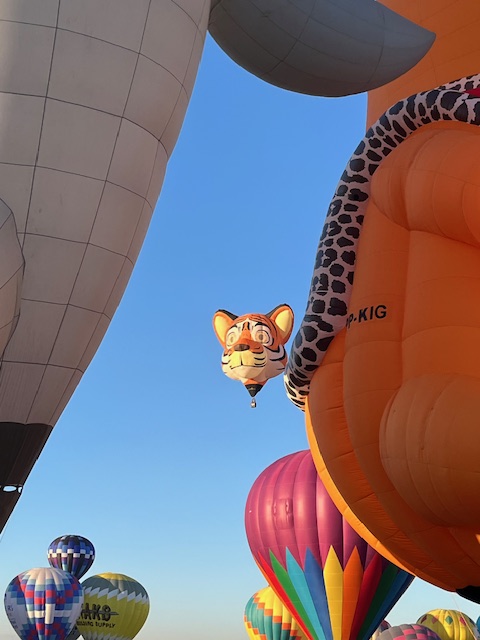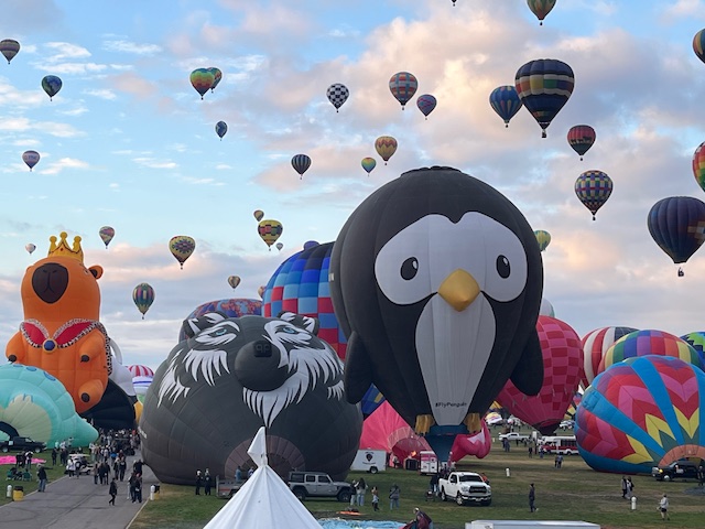 We learned why this is such a great location for balloonists: With the grounds situated in the Rio Grande River valley, the Sandia Mountain range to the east and the West Mesa and Petroglyph National Monument to the west it creates the “Albuquerque Box”. The wind tends to take the balloons one direction as they take off and after climbing to a higher altitude the wind is coming from the opposite direction and brings them back over the field area.